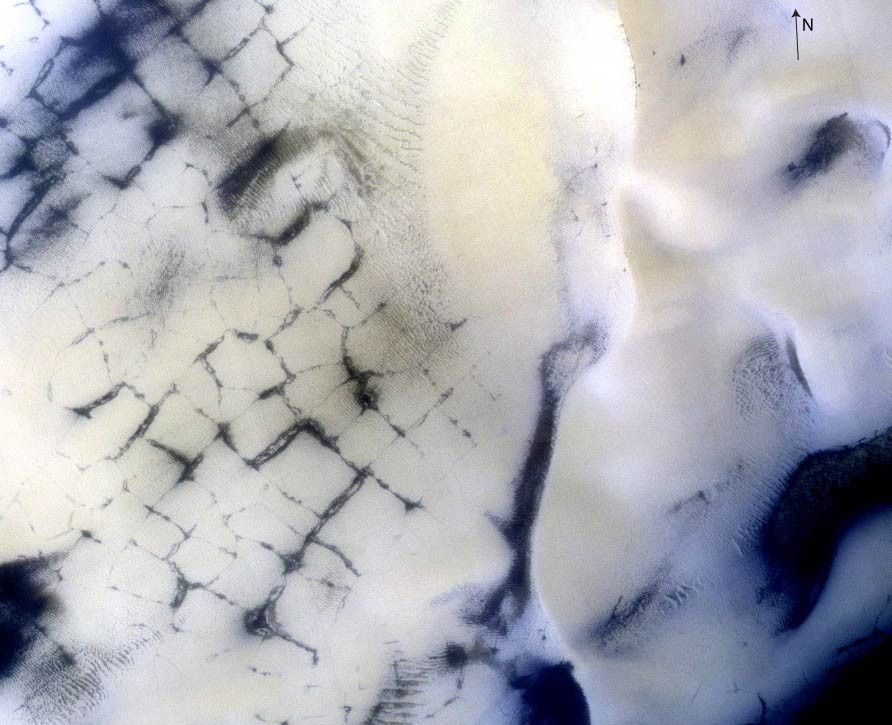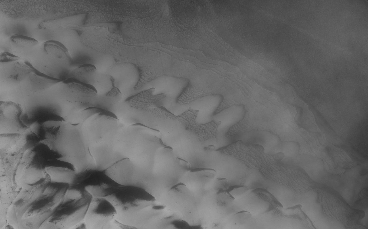 The north polar region of Mars is surrounded by a large sea of dark sand dunes that become covered by seasonal carbon dioxide frost. As the northern hemisphere begins to warm in the spring, the frozen carbon dioxide changes from a solid to a gas. The wind blows from an east-northeasterly direction and leaves dark streaks behind (exposed basalt) from the evaporating carbon dioxide. This image displays defrosting sand dunes in an unnamed crater.