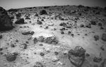 The left of the two forward cameras aboard Sojourner imaged this area of Martian terrain on Sol 26. The large rock dubbed "Pooh Bear" is at far left, and stands between four and five inches high. Mermaid Dune is the smooth area stretching horizontally across the top quarter of the image. The Alpha Proton X-Ray Spectrometer (APXS) instrument aboard Sojourner will be deployed on Mermaid Dune, and the rover will later use its cleated wheels to dig into it.