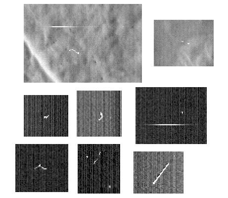 The image shows two portions of the Isidis Planitia image with bright noise at top, and 6 examples of bright noise seen in the cruise images; all are from the original, unprocessed images.