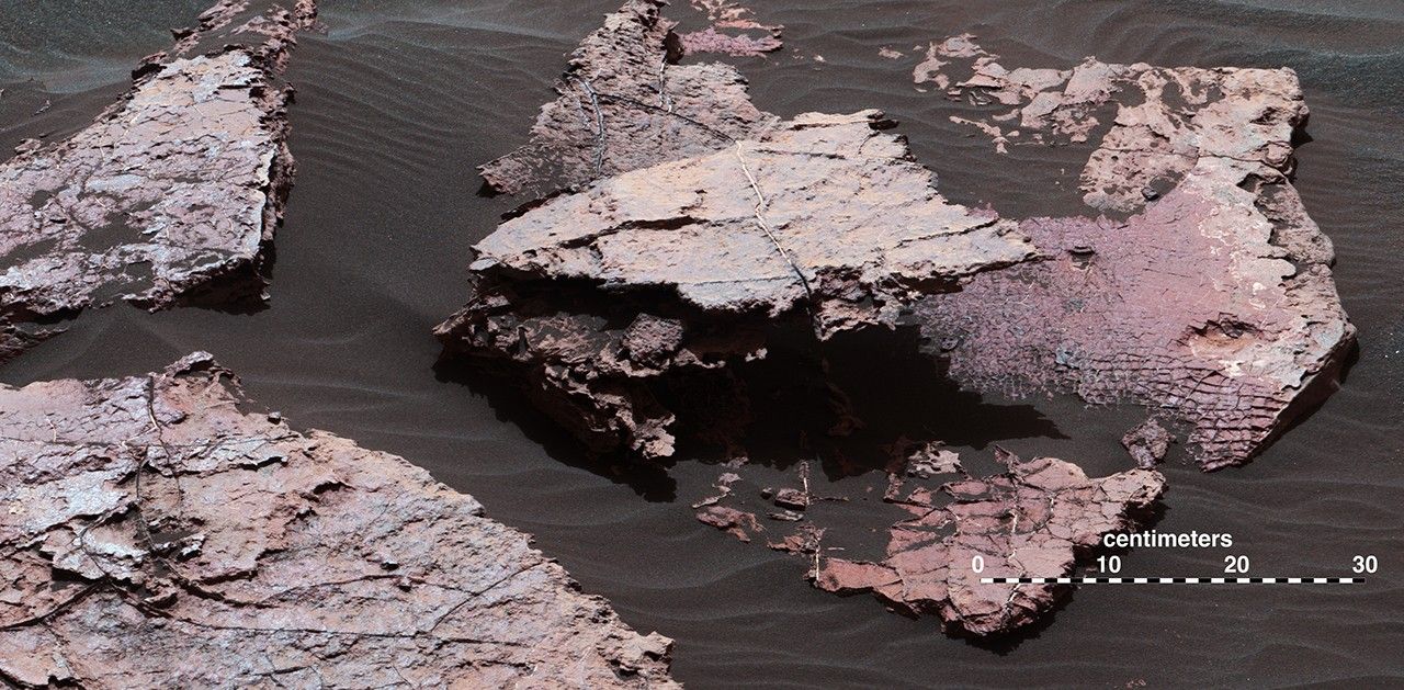 A grid of small polygons on the Martian rock surface near the right edge of this view may have originated as cracks in drying mud more than 3 billion years ago. Multiple images from the Mast Camera (Mastcam) on NASA's Curiosity Mars rover were combined for this mosaic of a block called "Squid Cove" and its immediate surroundings.