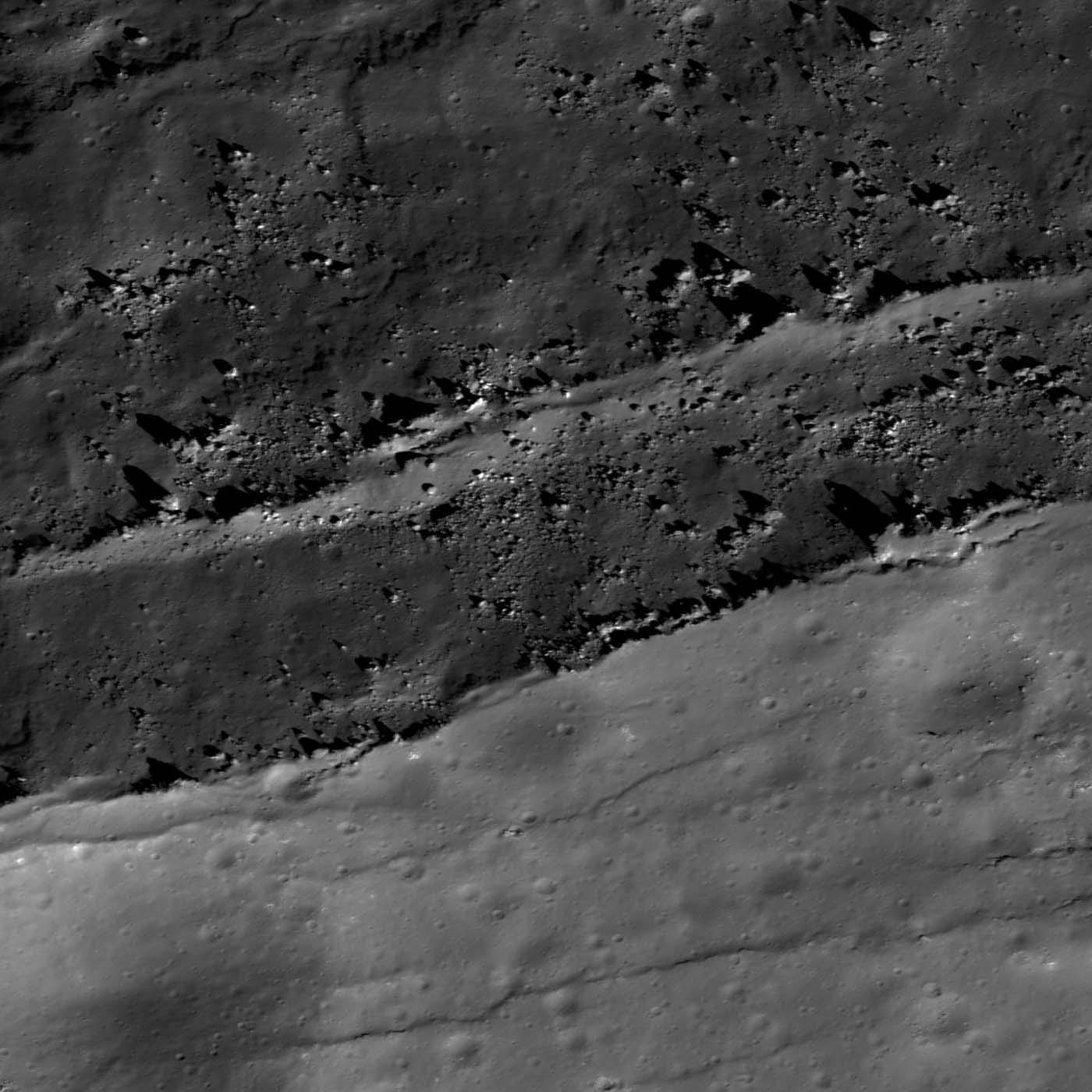 Fractured and slumping rim of Klute W crater. Image is 900 meters wide, LROC NAC M143201144RE.
