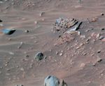 This false-color image taken by the panoramic camera on the Mars Exploration Rover Spirit shows the rock dubbed "Pot of Gold" (upper left), located near the base of the "Columbia Hills" in Gusev Crater. The rock's nodules and layered appearance have inspired rover team members to investigate the rock's detailed chemistry in coming sols. This picture was taken on sol 158 (June 13, 2004).