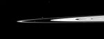 The elongated, potato-like shapes of the two moons are both visible here. Pandora (81 kilometers, or 50 miles across) orbits outside the F ring and, with the inner shepherd moon Prometheus, helps to keep the narrow lanes of the F ring in check. The gravity of Prometheus (86 kilometers, or 53 miles across) periodically creates the streamer-channels in the F ring. See PIA08397 to learn more. The bright specks at the top center and top left of the image are background stars.