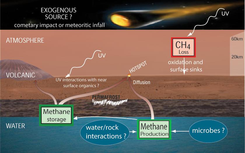 If the atmosphere of Mars contains methane, various possibilities have been proposed for where the methane could come from and how it could disappear.