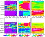 This figure shows the longitude-time variations, averaged between 21 and 22 degrees North, across the middle of the India subcontinent from mid-April to mid-June. Longitude from the Arabian Sea to the Bay of Bengal is represented on the horizontal axis; while the vertical axis shows the timeframe. Rainfall is shown on the left, soil moisture is in the center, and surface air temperature is on the right.
