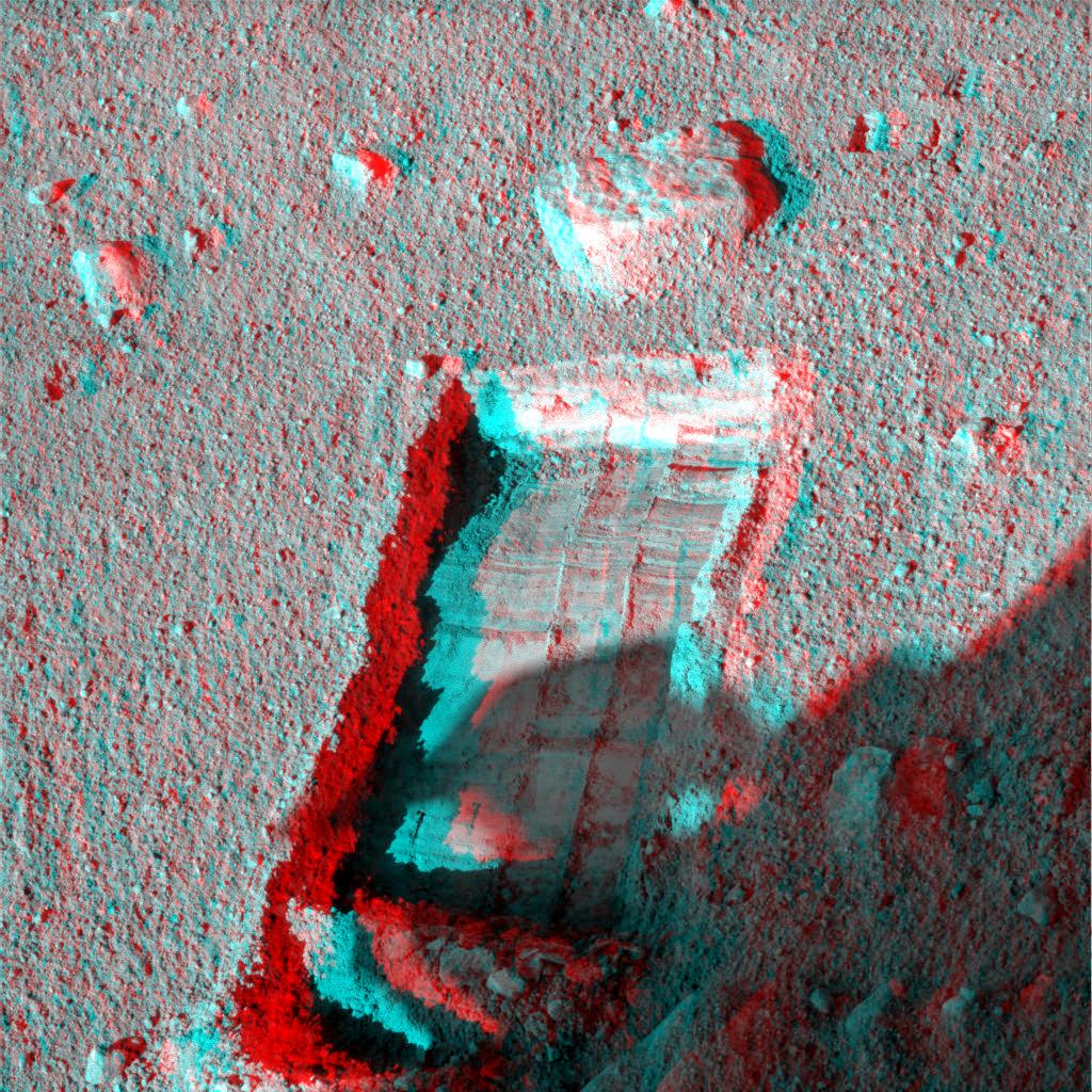 The left-eye and right-eye images combined into this stereo view were taken at about 4:35 p.m., local solar time on Mars. The scene appears three-dimensional when seen through blue-red glasses. The view is to the north northeast of the lander.