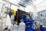 Engineers at NASA's Jet Propulsion Laboratory in Southern California examine one of Psyche's stowed solar arrays prior to a deployment test in the Lab's High Bay 2 clean room in late February 2022.