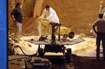Rover engineers prepare a mixture of sandy and powdery materials to simulate some difficult Mars driving conditions inside a facility at NASA's Jet Propulsion Laboratory, Pasadena, Calif. The tests in early May 2005 were designed to help plan the best way for the rover Opportunity to drive off of a soft-sand dune that the rover dug itself into the previous week.