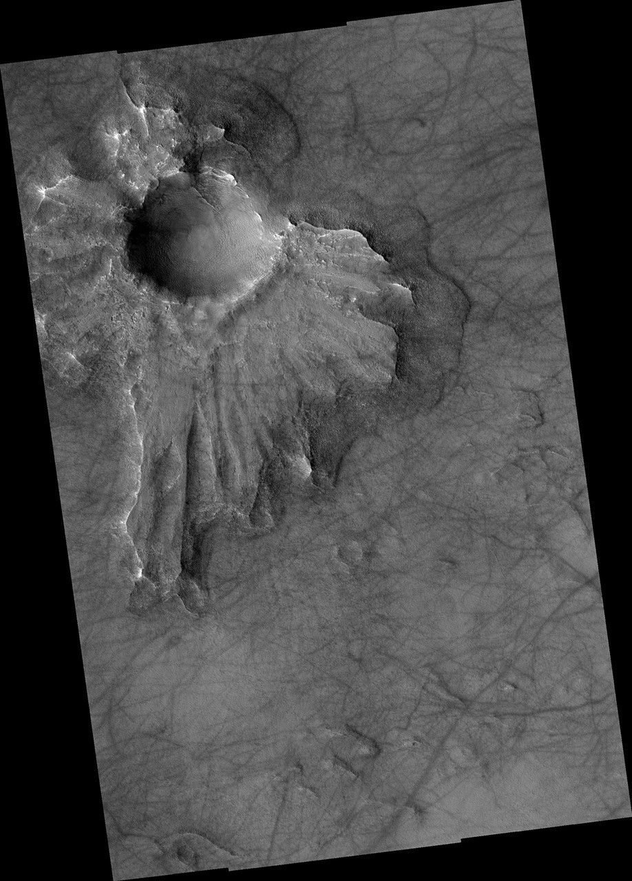 This HiRISE image shows what is termed a pedestal crater, so-called because the level of the surface adjacent to the crater is elevated relative to the surface of the surrounding terrain.