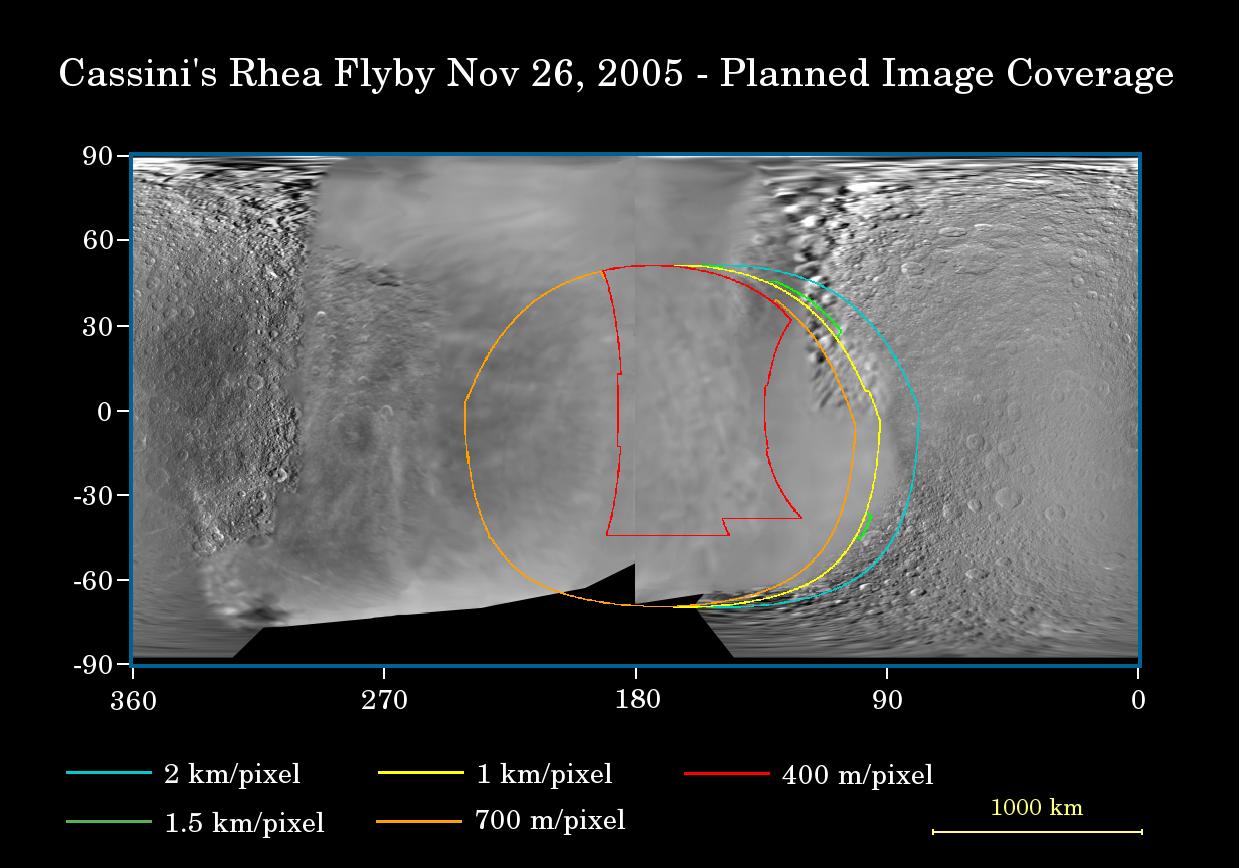This map of the surface of Saturn's moon, Rhea, illustrates the regions that will be imaged by Cassini during the spacecraft's close flyby of the moon on Nov. 26, 2005. At closest approach, the spacecraft is expected to pass approximately 500 kilometers (310 miles) above the moon's surface.