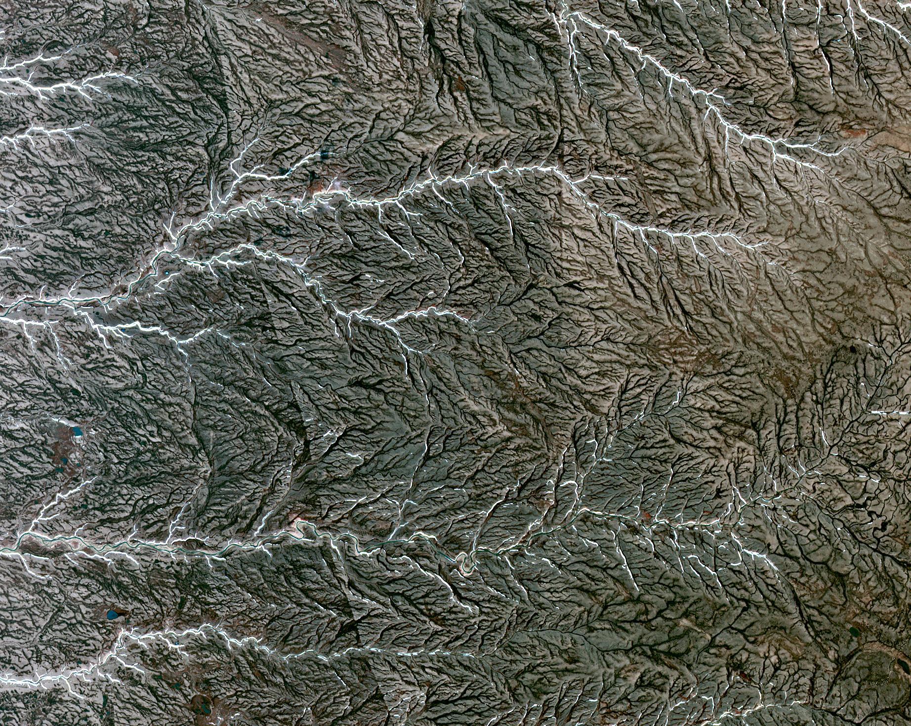 Prince Patrick Island is located in the Canadian Arctic Archipelago, and is the westernmost Elizabeth Island in the Northwest Territories of Canada. The island is underlain by sedimentary rocks, cut by still-active faults. The streams follow a dendritic drainage system: there are many contributing streams (analogous to the twigs of a tree), which are then joined together into the tributaries of the main river (the branches and the trunk of the tree, respectively). They develop where the river channel follows the slope of the terrain. The image covers an area of 22 by 27 km, was acquired July 2, 2011, and is located at 76.9 degrees north, 118.9 degrees west.