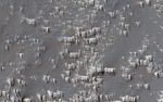 In Syria Planum, unusual bright deposits might be accumulations of dust blown from higher to lower elevations by nighttime slope winds, reaching speeds of up to 50 meters per second. These dust deposits resemble TARs in height and spacing but with a distinct shape from other TARs. A close up view shows that the deposits form pyramidal features with steep faces on the upwind sides (wind is blowing from the top of the picture) and tapered slopes in the downwind direction. Ridges form where the "pyramids" line up together, and the spacing of the ridges appears to be controlled by the length of the "pyramids."