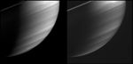 The images were taken with the Cassini spacecraft wide-angle camera on May 4, 2005, at a distance of approximately 1.2 million kilometers (800,000 miles) from Saturn. The image at the left was obtained using a combination of filters sensitive to wavelengths of polarized and infrared light centered at 705 and 728 nanometers, respectively. The image at the right was taken using a spectral filter sensitive to wavelengths of infrared light centered at 890 nanometers. The image scale is 73 kilometers (45 miles) per pixel.