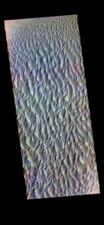 The THEMIS VIS camera contains 5 filters. The data from different filters can be combined in multiple ways to create a false color image. These false color images may reveal subtle variations of the surface not easily identified in a single band image. Today's false color image shows sand dunes within Proctor Crater. These dunes are composed of basaltic sand that has collected in the bottom of the crater. The topographic depression of the crater forms a sand trap that prevents the sand from escaping. Dune fields are common in the bottoms of craters on Mars and appear as dark splotches that lean up against the downwind walls of the craters. Dunes are useful for studying both the geology and meteorology of Mars. The sand forms by erosion of larger rocks, but it is unclear when and where this erosion took place on Mars or how such large volumes of sand could be formed. The dunes also indicate the local wind directions by their morphology. In this case, there are few clear slipfaces that would indicate the downwind direction. The crests of the dunes also typically run north-south in the image. This dune form indicates that there are probably two prevailing wind directions that run east and west (left to right and right to left). Proctor Crater is located in Noachis Terra and is 172km (107miles) in diameter.