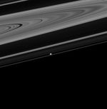 Prometheus shows up bright in this image of the dark side of the rings.