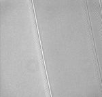 A close-up of Saturn's A ring reveals dozens of small, bright streaks aligned with the orbital direction of the rings. These objects are the propeller-shaped features first captured in Cassini images during the spacecraft's 2004 orbital insertion maneuver, as Cassini skimmed just above the ringplane.