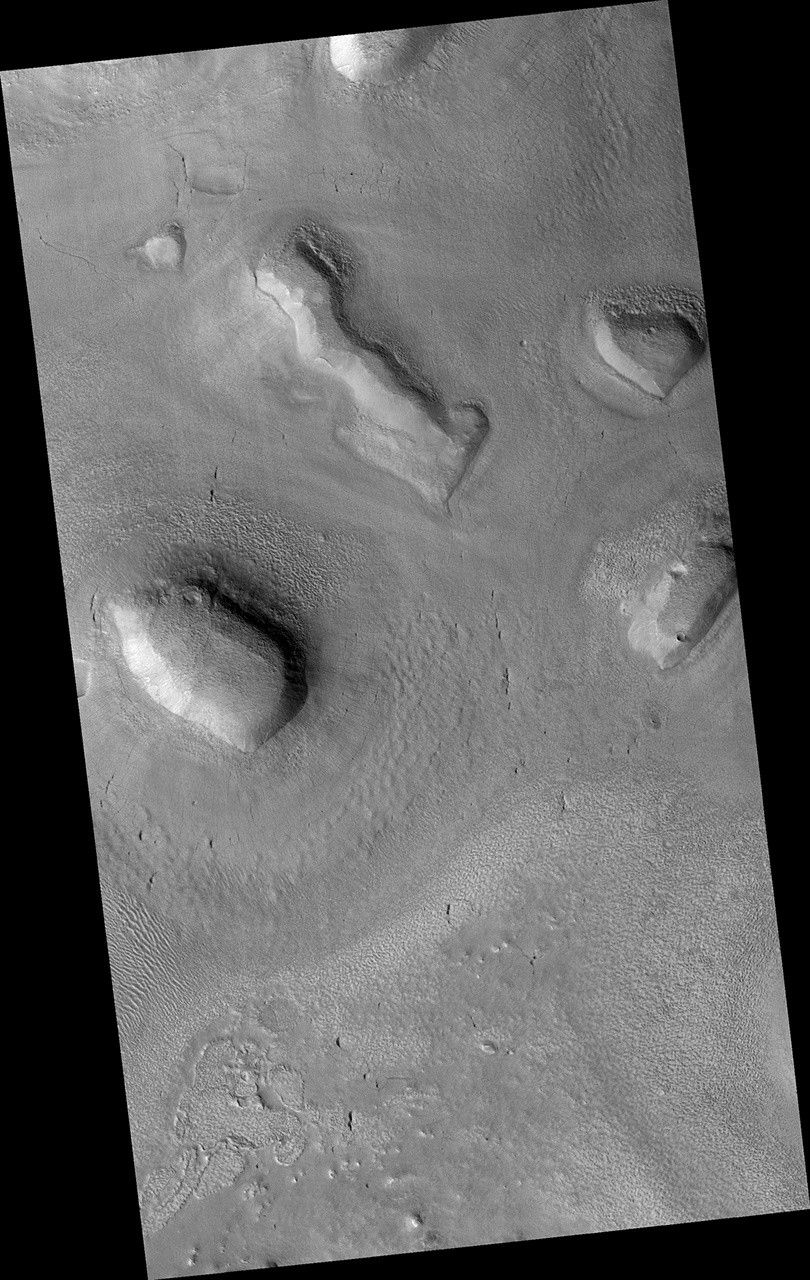 We can see a flow of material through the valleys between a complex of small mesas. Streamlines and flow fronts appear as subtle ridges. Some ridges appear perpendicular to the mesas indicating flow direction. Others appear concentric to the mesas and parallel to the valleys, where debris and now-underlying ice bunched up and moved down valley.