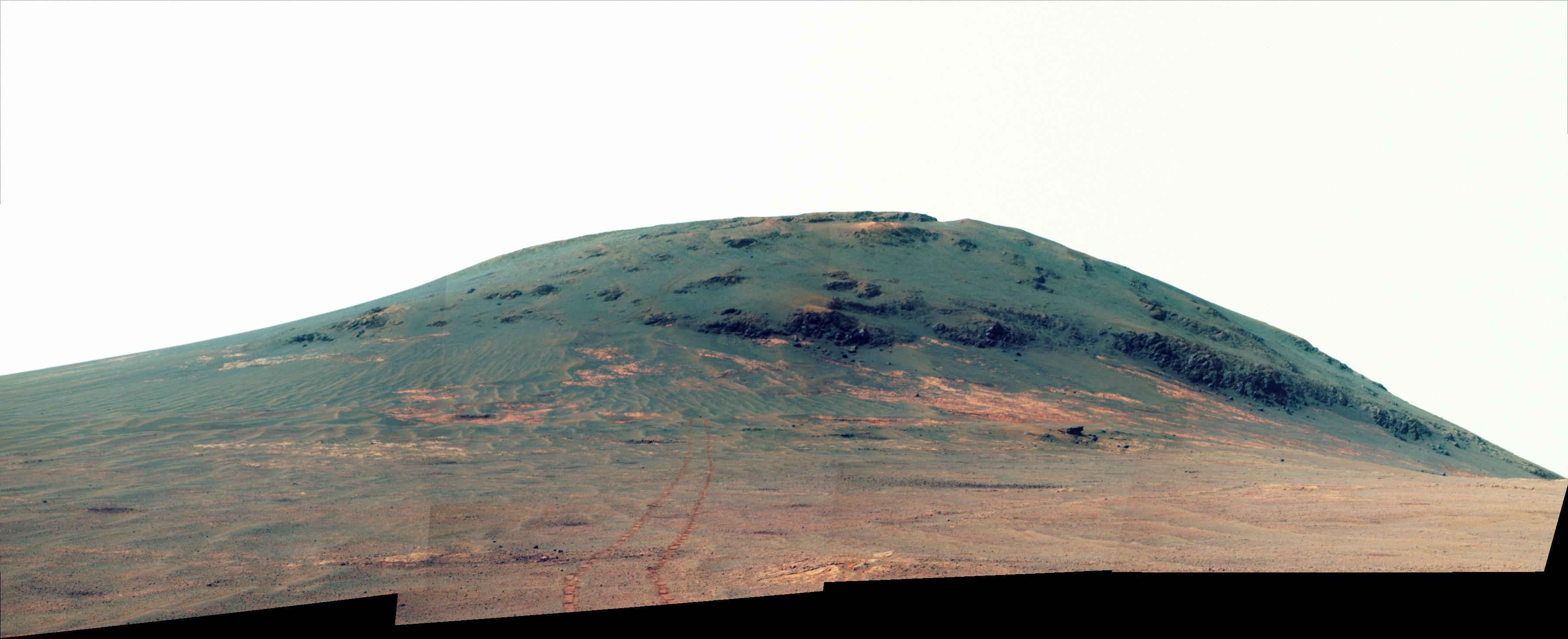 NASA's Mars Exploration Rover Opportunity worked for 30 months on a raised segment of Endeavour Crater's rim called "Cape Tribulation" until departing that segment in mid-April 2017, southbound toward a new destination. This view looks back at the southern end of Cape Tribulation from about two football fields' distance away. In this version of the scene the landscape is presented in enhanced color to make differences in surface materials more easily visible.
