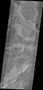 Platy lava flows in Elysium look very different from the thicker flows of the Tharsis region. In this VIS image, the darker plates are separated by lighter material and some edges "match-up" like puzzle pieces.