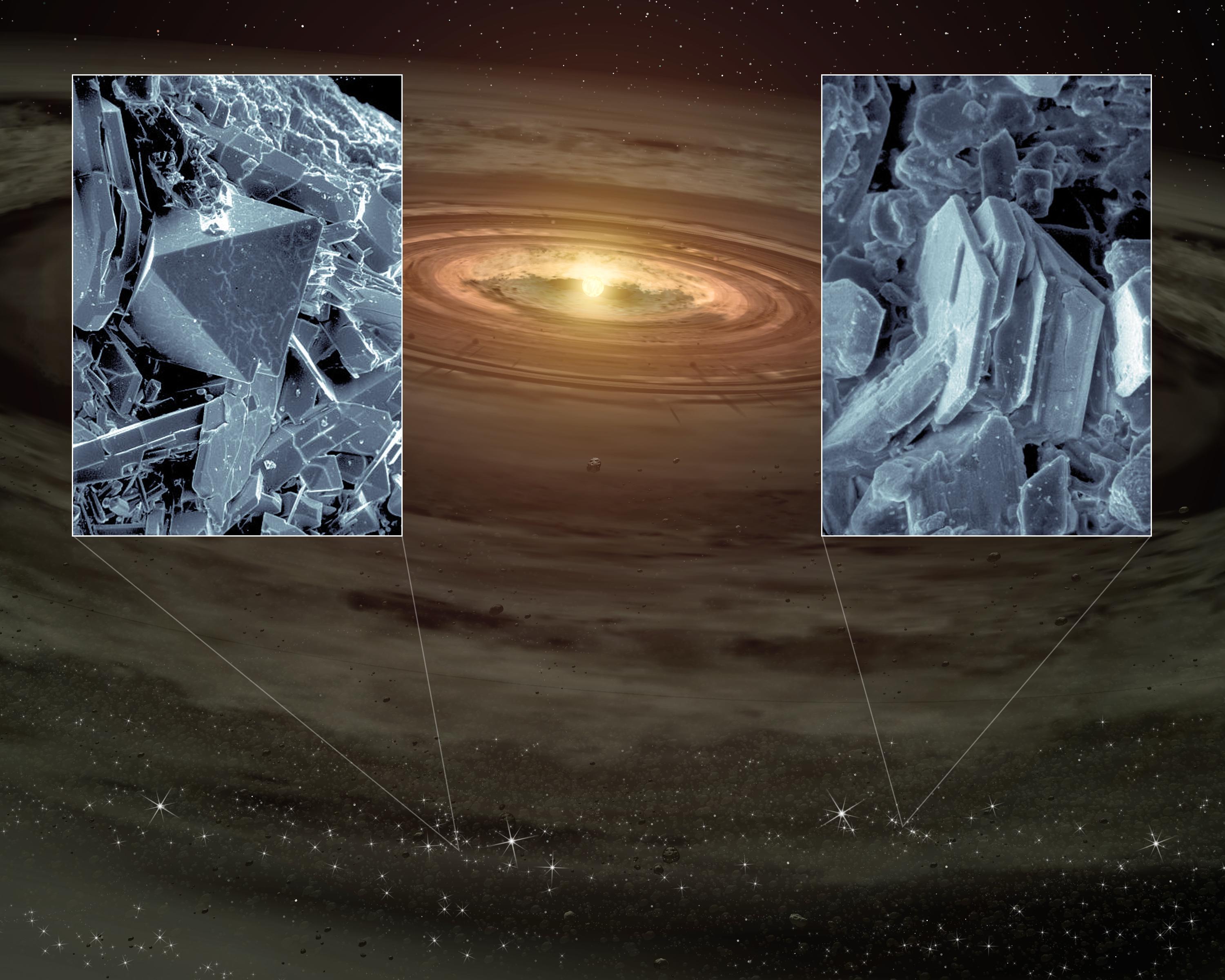 NASA's Spitzer Space Telescope has, for the first time, detected tiny quartz-like crystals sprinkled in young planetary systems. The crystals, which are types of silica minerals called cristobalite and tridymite, can be seen close-up in the black-and-white insets (cristobalite is on the left, and tridymite on the right). The main picture is an artist's concept of a young star and its swirling disk of planet-forming materials.