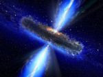 This artist's concept illustrates a quasar, or feeding black hole, similar to APM 08279+5255, where astronomers discovered huge amounts of water vapor. Gas and dust likely form a torus around the central black hole, with clouds of charged gas above and below. X-rays emerge from the very central region, while thermal infrared radiation is emitted by dust throughout most of the torus. While this figure shows the quasar's torus approximately edge-on, the torus around APM 08279+5255 is likely positioned face-on from our point of view.