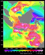Data obtained from QuikScat on December 30 and January 1 shed new insights into the atmospheric conditions at the time of these incidents. QuikScat data are available in near real time to operational weather forecasting agencies around the world. The data from December 30 and January 1 observed that the strong winds in the Java Sea originated from the surge of a strong winter monsoon from the Asian continent. The monsoon winds blew south across the South China Sea and deflected eastward after they crossed the equator due to the rotation of Earth. The winds strengthened as they were channeled through the land masses of Indonesia. The winds in the Java Sea remained strong through January 1, 2007. Associated with the eastward winds, twin cyclones (a counter-clockwise circulation in the Northern Hemisphere and a clockwise circulation in the Southern Hemisphere) were also observed by QuikScat; the stronger one was south of the equator (summer hemisphere) between Java and Australia, and a weaker one was north of the equator (winter hemisphere) west of Borneo. In this image from January 1, the different colors denote different wind speeds. White arrows are wind vectors showing both direction and speed.