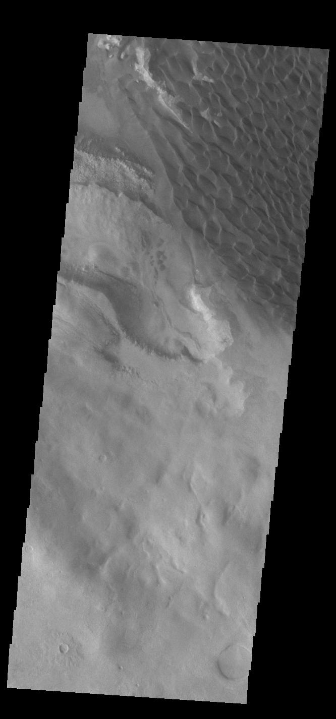The dunes seen in this VIS image are located on the complex floor of Rabe Crater. The sand is likely derived by erosion into the deposit that fills most of the crater floor, creating a pit which hosts the dunes. Rabe Crater is located in Noachis Terra and is 108km in diameter (67 miles).