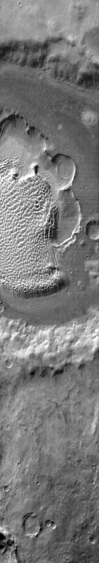 Note: this THEMIS visual image has not been radiometrically nor geometrically calibrated for this preliminary release. An empirical correction has been performed to remove instrumental effects. A linear shift has been applied in the cross-track and down-track direction to approximate spacecraft and planetary motion. Fully calibrated and geometrically projected images will be released through the Planetary Data System in accordance with Project policies at a later time.