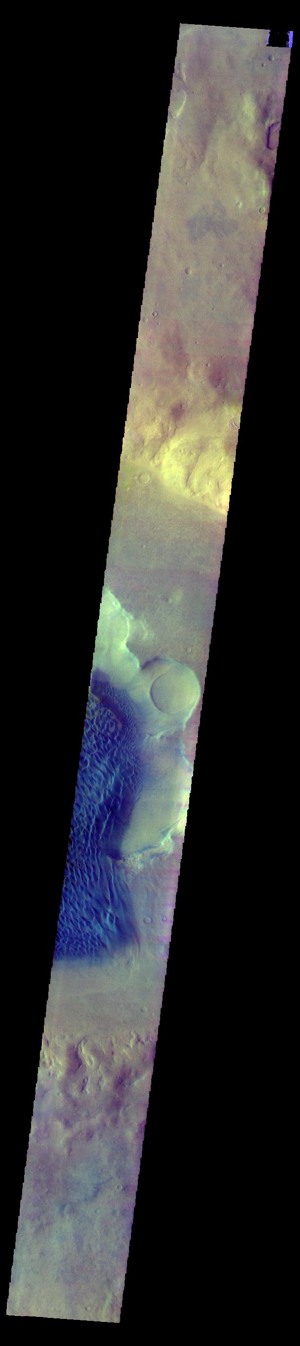 The THEMIS VIS camera contains 5 filters. The data from different filters can be combined in multiple ways to create a false color image. These false color images may reveal subtle variations of the surface not easily identified in a single band image. Today's false color image shows part of the floor of Rabe Crater, including part of the dune field. Rabe Crater is located in Noachis Terra.