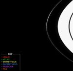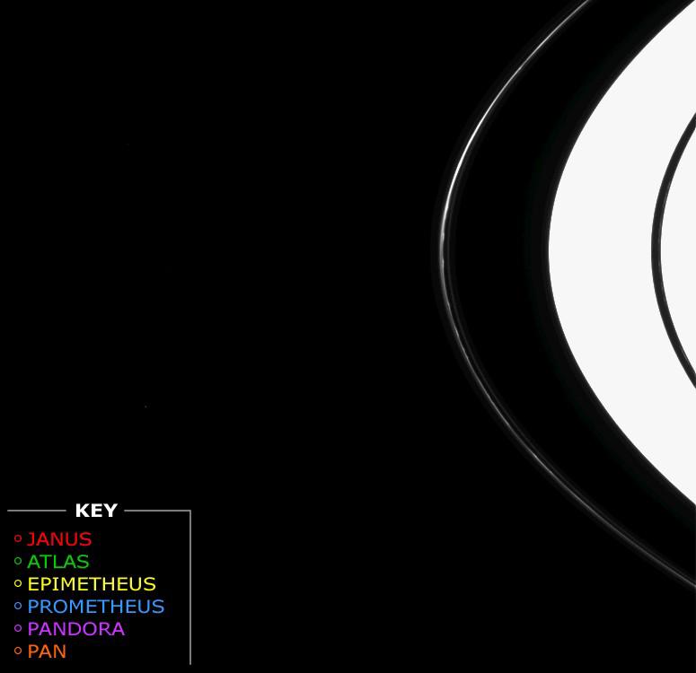 The moons appear in following order (their diameters are given in parentheses): Janus (181 kilometers, or 113 miles), Atlas (32 kilometers, or 20 miles), Epimetheus (116 kilometers, or 72 miles), Prometheus (102 kilometers, or 63 miles), Pandora (84 kilometers, or 52 miles) and Pan (20 kilometers, or 12 miles). Each moon is marked by a colored circle that corresponds to the key at lower left.