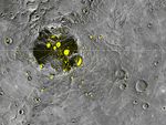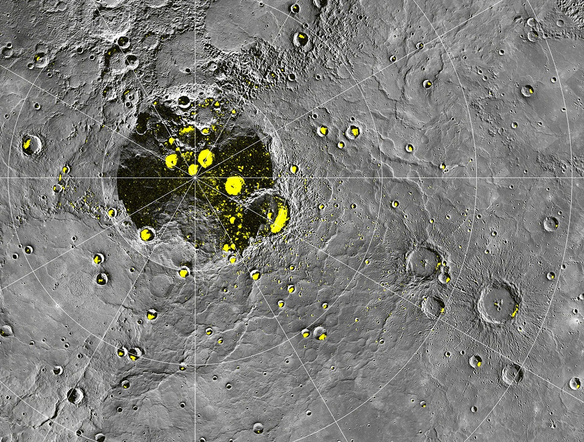 The highest-resolution radar image of Mercury's north polar region made from the Arecibo Observatory (Harmon et al., Icarus, 211, 37-50, 2011) is shown in yellow on a mosaic of MESSENGER orbital images. Radar-bright features in the Arecibo image all collocate with areas mapped as in shadow in Mercury Dual Imaging System (MDIS) images to date, consistent with the proposal that radar-bright materials contain water ice. This image is shown in a polar stereographic projection with every 5° of latitude and 30° of longitude indicated and with 0° longitude at the bottom. On Mercury, 5° of latitude is approximately 213 km.