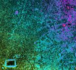 This image, with a pixel spacing of 5 meters (16.4 feet), depicts an area of approximately 5 by 4.7 kilometers (3.1 by 2.9 miles). North is at top. Image brightness is from the P-band (68 centimeters, or 26.8 inches) wavelength radar backscatter, a measure of how much energy the surface reflects back toward the radar. Color is used to represent elevation contours. One cycle of color represents 25 meters (82 feet) of elevation change, so going from blue to red to yellow to green and back to blue again corresponds to 25 meters (82 feet) of elevation change.