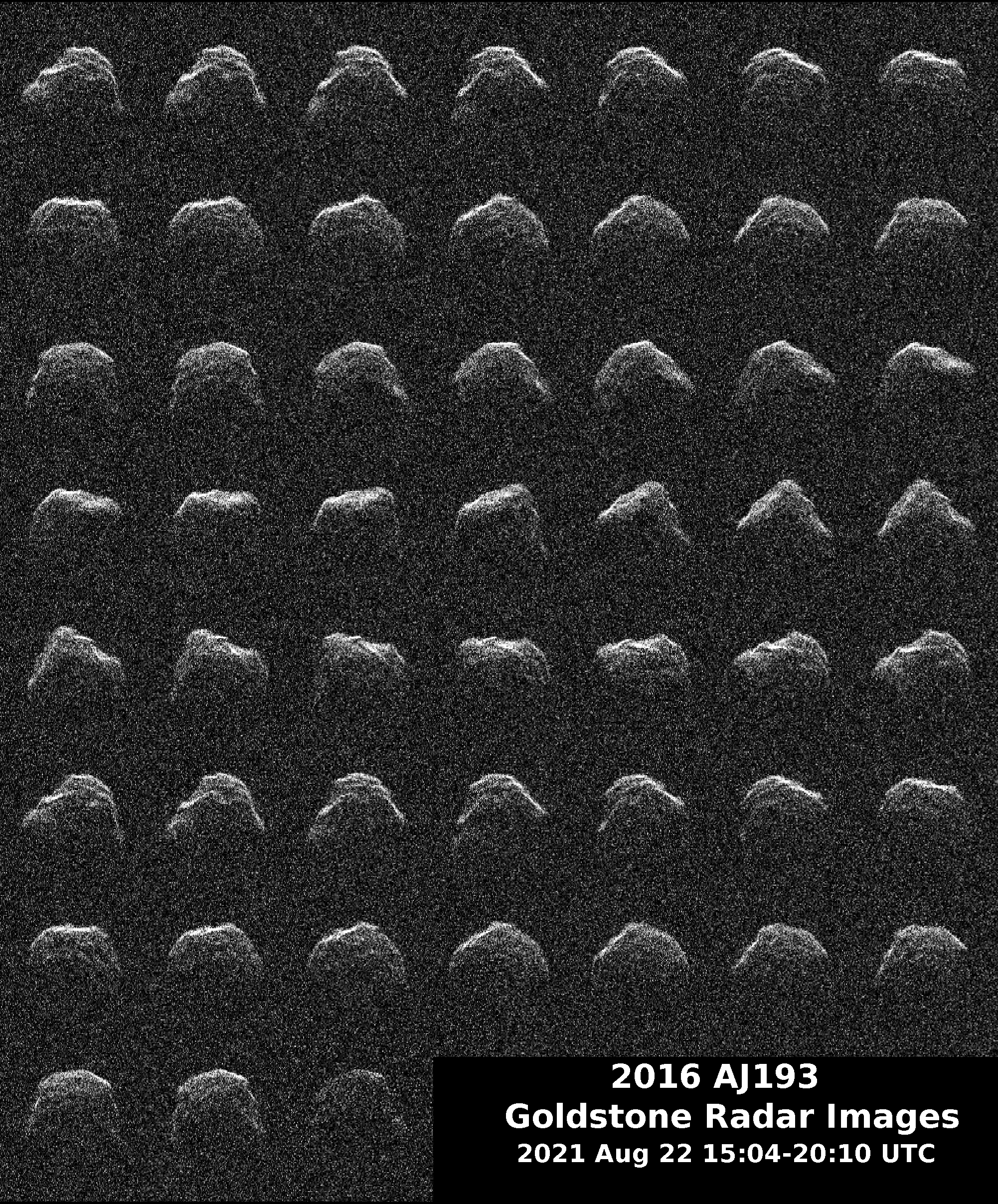 Between Aug. 20 and 24, near-Earth asteroid (NEA) 2016 AJ193 drifted past Earth at a distance of 2.1 million miles (about 3.4 million kilometers), creating an opportunity for planetary radar to image its surface for the first time since its discovery in 2016. Using the 70-meter (230-foot) Deep Space Station 14 antenna at the Deep Space Network's Goldstone Deep Space Complex near Barstow, California, considerable detail in the asteroid's surface was revealed, including ridges, small hills, flat areas, concavities, and possible boulders. In addition, the radar observations of 2016 AJ193 confirmed that it is about three-quarters-of-a-mile (1.3-kilometers) wide. This series of images show the asteroid rotate (with a period of 3.5 hours) as each radar observation was made.