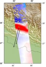 The KMZ file for viewing the radar measurement image in Google Earth is available at http://aria-share.jpl.nasa.gov/events/20150425-Nepal_EQ/interferogram/ARIA_Coseismic_ALOS2_interferogram_PathA157_20150221_0502_1_5m.kmz.