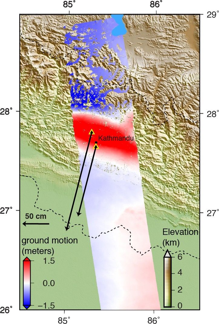 In this new map, the colors of the surface displacements are proportional to the surface motion. The red tones show the areas where the land around Kathmandu has moved toward the satellite by up to 4.6 feet (1.4 meter), or 5.2 feet (1.6 meters) if purely vertical motion is assumed. The area farther north with various shades of blue moved away from the satellite, mostly downward, by as much as 3.9 feet (1.2 meters). Areas without color have snow, heavy vegetation or open water that prevents the radar measurements from measuring change between satellite images. The background image shows the shaded relief and colored elevation from the NASA Shuttle Radar Topography Mission (SRTM). Black arrows show the horizontal motion measured by continuously operating Global Positioning System (GPS) sites (yellow and black triangles). Scientists use these maps to build detailed models of the fault slip at depth and associated land movements to better understand the impact on future earthquake activity. These data have been integrated into the U.S. Geological Survey ShakeMap (available at: http://earthquake.usgs.gov/earthquakes/eventpage/us20002926#impact_shakemap) to update their estimate of the intensity of ground shaking caused by the main shock of the quake. The PALSAR-2 data were provided by JAXA through the Committee on Earth Observation Satellites (CEOS) in support of the response effort. Dashed black lines show the country borders.