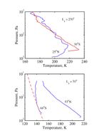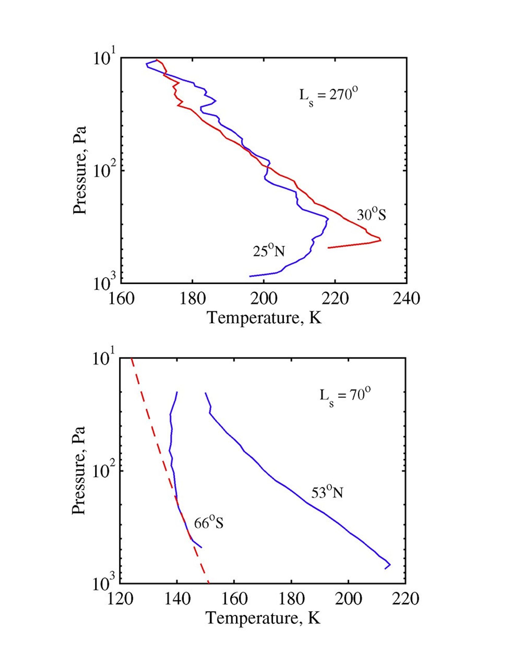 Vertical temperature and pressure structure observed in the northern and southern hemispheres. Upper panel for Ls = 270 (northern winter); lower panel for Ls=70 (southern winter), dashed line is freezing line for CO2 ice.