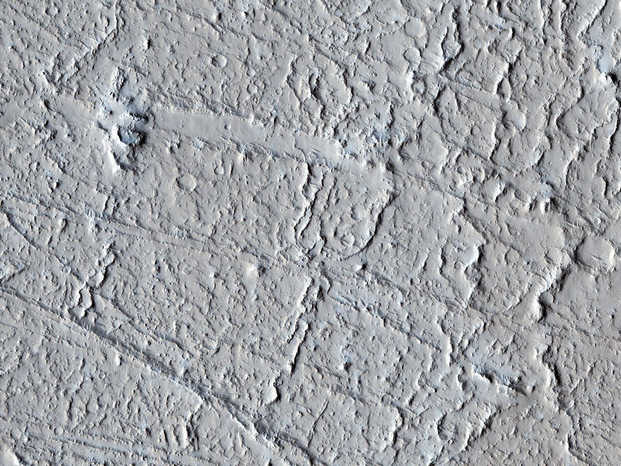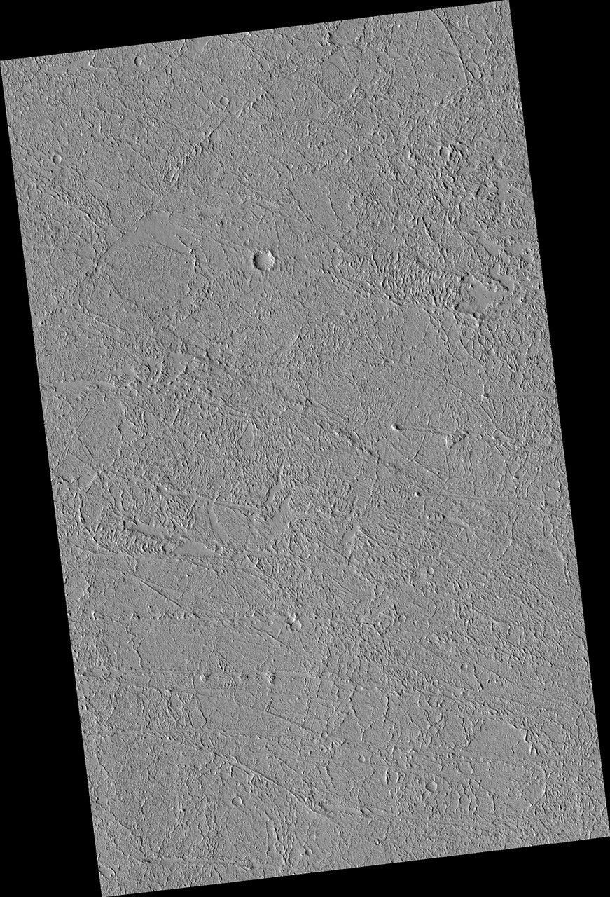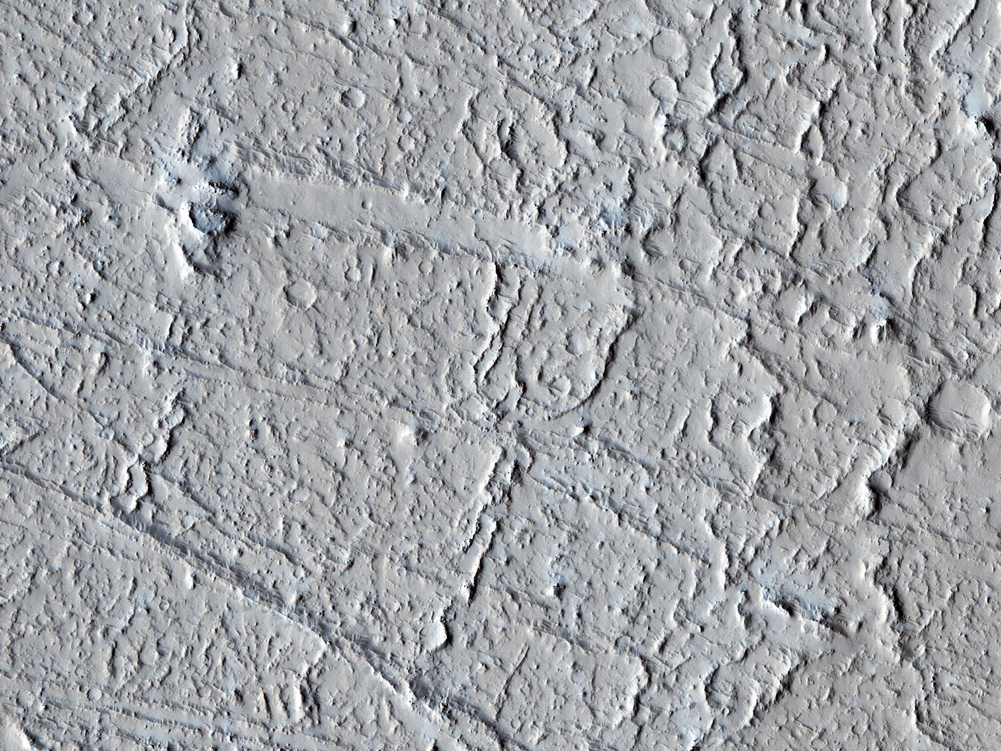 This area of Amazonis Planitia to the west of the large volcano Olympus Mons was once flooded with lava. A huge eruption flowed out across the relatively flat landscape. Sometimes called "flood basalt," the lava surface quickly cooled and formed a thin crust of solidified rock that was pushed along with the flowing hot liquid rock. Hills and mounds that pre-dated the flooding eruption became surrounded, forming obstructions to the relentless march of lava.