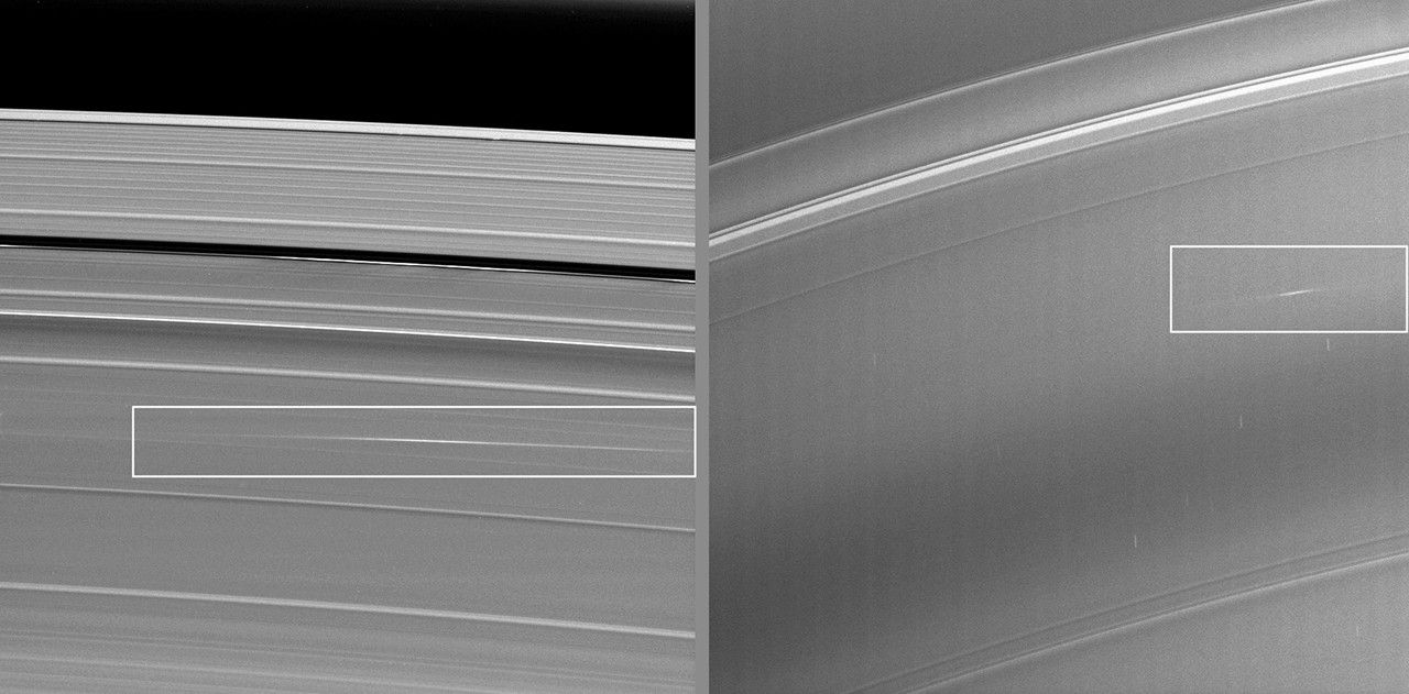 Objects, each estimated to be one meter (3 feet) in size and traveling tens of kilometers per second (tens of thousands of miles per hour), likely smashed into the rings and created elevated clouds of tiny particles that have been sheared out, or elongated and tilted, by orbital motion into bright streaks.