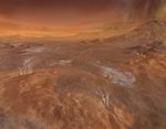 Radar data show that the arc of Hotei is the boundary between rugged mountains to the south and east and a broad valley. Emerging from the mountains are several radar-bright channels that are likely now dry river beds that were carved by flowing methane due to rainfall. Within the valley, the channels end near lobate (blobby) flows some 100 to 200 meters (300 to 600 feet) thick, which some scientists think could be slushy ice lava from cryovolcanoes. These flows are portrayed here as the rough and elevated lighter tan areas in the foreground. It is possible that such phenomena could release methane from beneath the surface, helping to explain how Titan's atmosphere sustains its supply of methane.