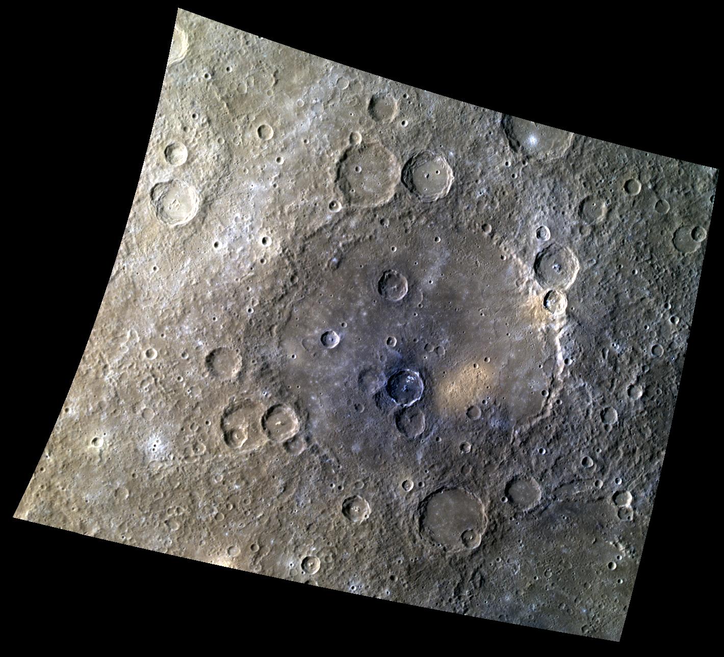This colorful image of the impact basin Raphael shows a diversity of compositions within the volcanic plains that flooded the basin's floor. Hollows appear to be forming in the low reflectance material within the smaller, roughly 40-kilometer (25-mile) diameter complex crater just south of the center of the basin.