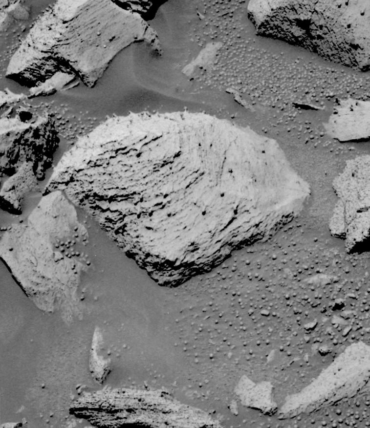 This image is from the rover's panoramic camera and features Pilbara before the rover ground into it with its rock abrasion tool. After careful examination of the rock, the rock abrasion tool engineers determined that the upper left portion (visible in this image) of Pilbara was the safest area to grind. The now familiar "blueberries," or spherules, are present in this rock, however, they do not appear in the same manner as other berries examined during this mission. Reminiscent of a golf tee, the blueberries sit atop a "stem," thus making them even more of an obstacle through which to grind. The left side of the rock is relatively berry-free and proved to be an ideal spot for the procedure.