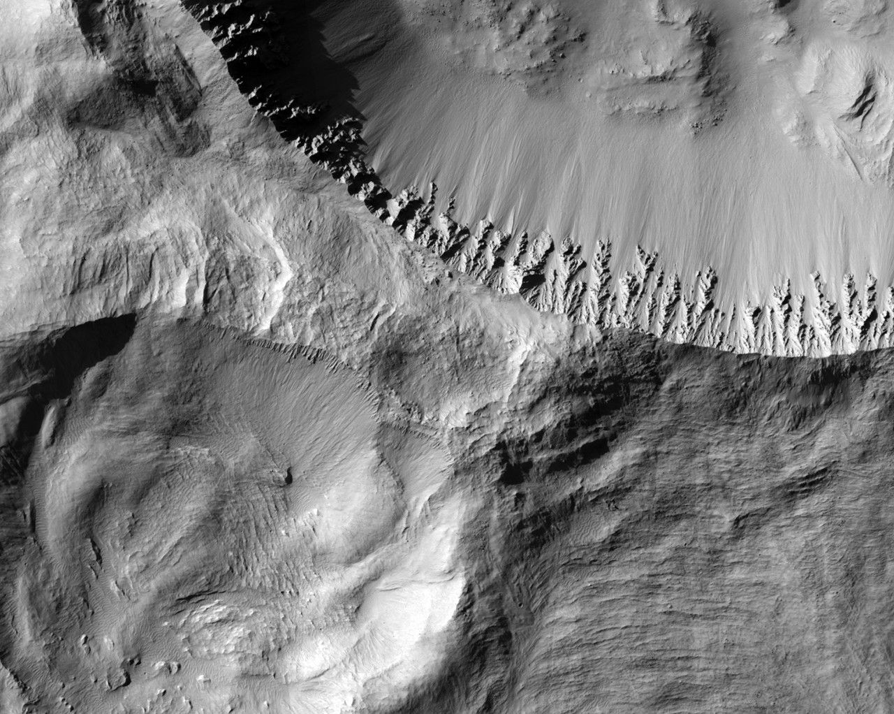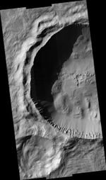This HiRISE image covers the western portion of the primary cavity of Gratteri crater situated in the Memnonia Fossae region. Gratteri crater is one of five definitive large rayed craters on Mars. Gratteri crater has a diameter of approximately 6.9 kilometers. Crater rays are long, linear features formed from the high-velocity ejection of blocks of material that re-impact the surface in linear clusters or chains that appear to emanate from the main or primary cavity. Such craters have been long recognized as the "brightest" and "freshest" craters on the Moon. However, Martian rays differ from lunar rays in that they are not "bright," but best recognized by their thermal signature (at night) in 100 meter/pixel THEMIS thermal infrared images. The HiRISE image shows that Gratteri crater has well-developed and sharp crater morphologic features with no discernible superimposed impact craters. The HiRISE sub-image shows that this is true for the ejecta and crater floor up to the full resolution of the image. Massive slumped blocks of materials on the crater floor and the "spur and gully" morphology with the crater wall may suggest that the subsurface in this area may be thick and homogenous. Gratteri crater's ejecta blanket (as seen in THEMIS images) can be described as "fluidized," which may be suggestive of the presence of ground-ice that may have helped to "liquefy" the ejecta as it was deposited near the crater. Gratteri's ejecta can be observed to have flowed in and around obstacles including an older, degraded crater lying immediately to the SW of Gratteri's primary cavity.