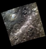 Today's color image, which is similar to this monochrome view, contains part of the crater Soseki in the northwest. A scarp cuts through craters in the right side of the image, though it does not stand out in this high-Sun view. The bright band crossing from upper right to lower left is a ray from the crater Hokusai which is located far away to the northeast. Hokusai's rays overprint older craters and cover a large portion of the planet.