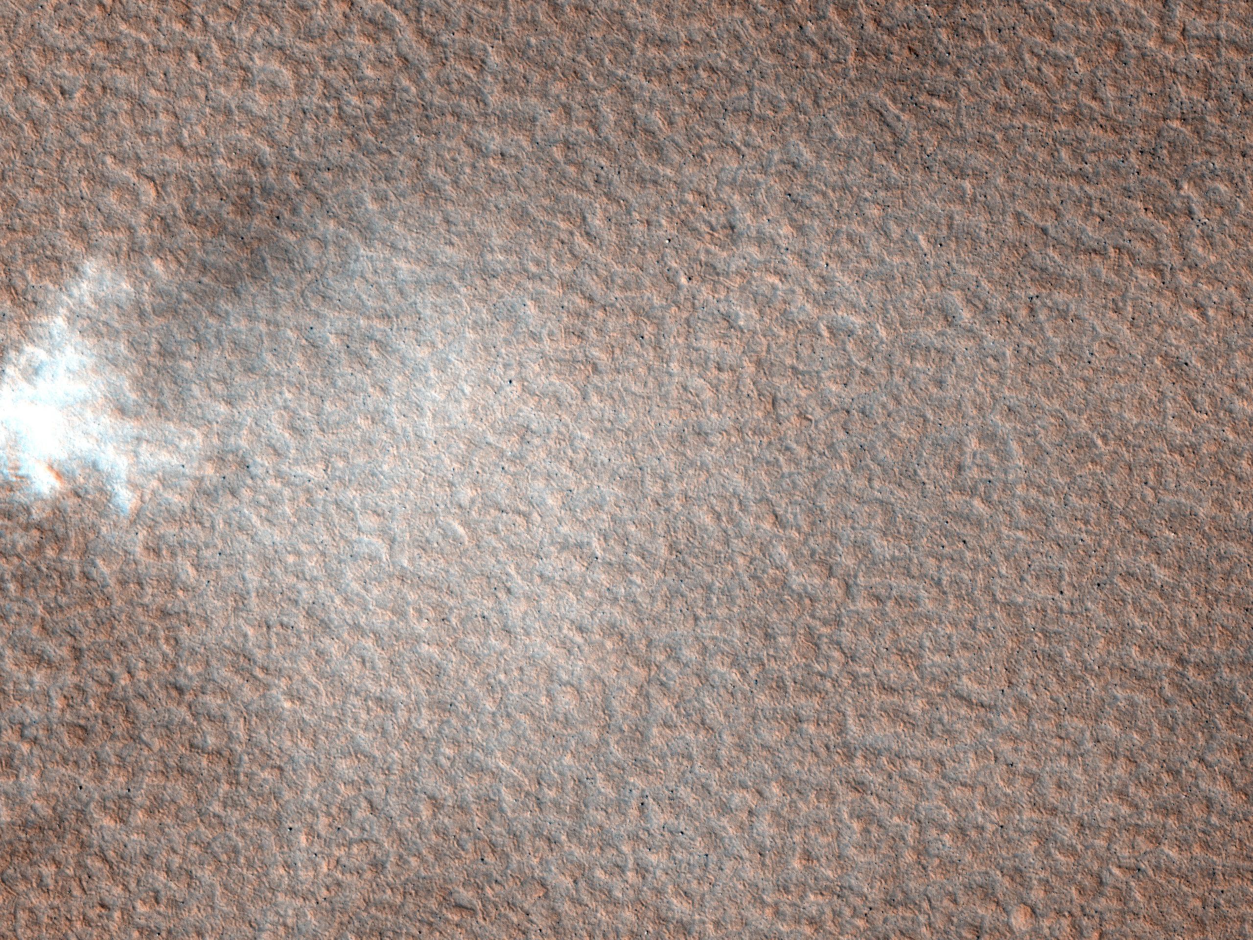 This image was targeted to study knobs in Mars' northern plains, just north of Scandia Crater. The knobs are clearly imaged, but what surprised scientists was a dust devil visible in the south-central part of the image (see inset above).
