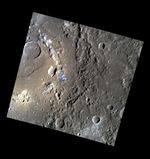 This enhanced-color scene lies on the edge of Praxiteles, a peak-ring basin approximately 200 km in diameter. The high-reflectance, redder areas are irregularly shaped pits likely formed by volcanic activity, and the high-reflectance, bluer areas are hollows. Pits and hollows are often found together on Mercury. Their relationship to one another is the subject of ongoing investigation by the MESSENGER team.