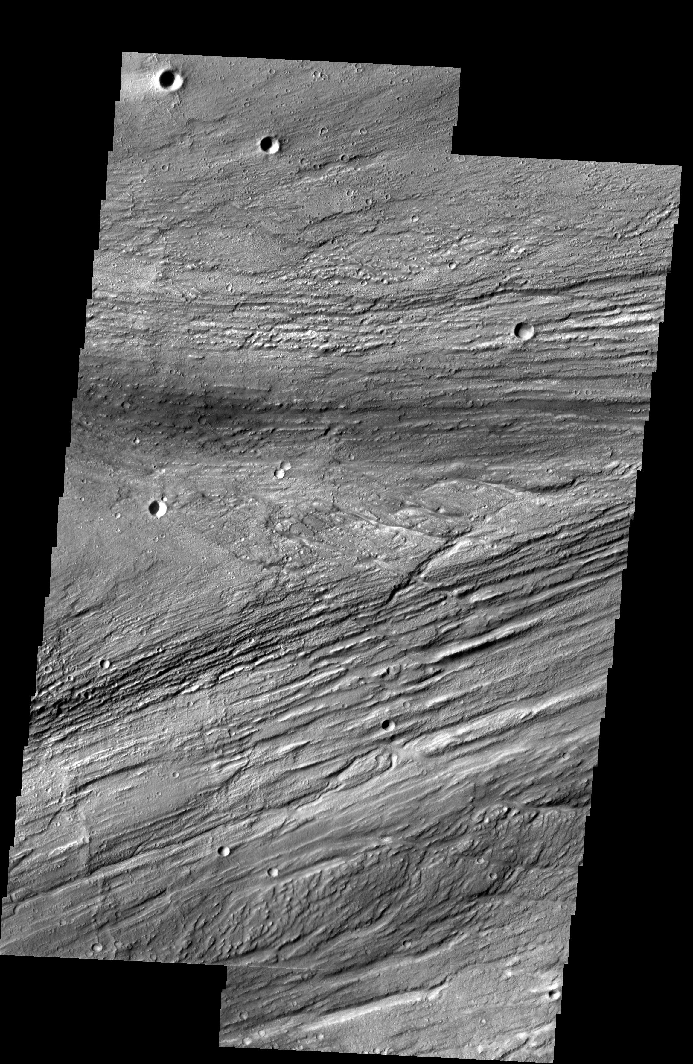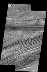 Note: this THEMIS visual image has not been radiometrically nor geometrically calibrated for this preliminary release. An empirical correction has been performed to remove instrumental effects. A linear shift has been applied in the cross-track and down-track direction to approximate spacecraft and planetary motion. Fully calibrated and geometrically projected images will be released through the Planetary Data System in accordance with Project policies at a later time.
