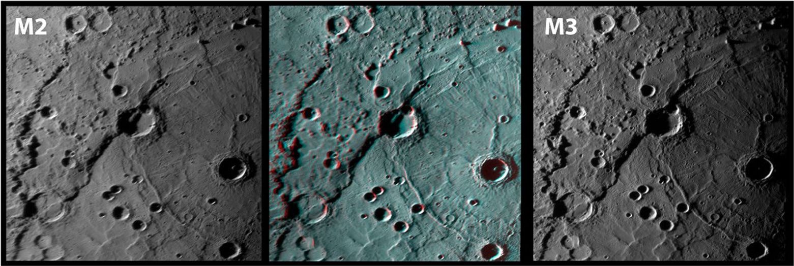 The central graphic shows a portion of Rembrandt basin (715 kilometers, or 444 miles, in diameter) as an anaglyph, or a three-dimensional (3D) image. Standard 3-D glasses (which can be assembled at home), with a red filter in front of the left eye and a blue filter in front of the right, can be used to view this picture. This anaglyph was made by overlaying two mosaics of the same area of Mercury taken from different angles. The viewing directions for the images of Rembrandt acquired during MESSENGER's third flyby (M3) on September 29, 2009, and second flyby (M2) on October 6, 2008, differ by approximately 20°. Combining the two viewing geometries creates a stereo effect, allowing the perception of exaggerated depth when viewed through 3D glasses. Here, the M2 image in red was superposed on the M3 image in blue to create the 3D image.