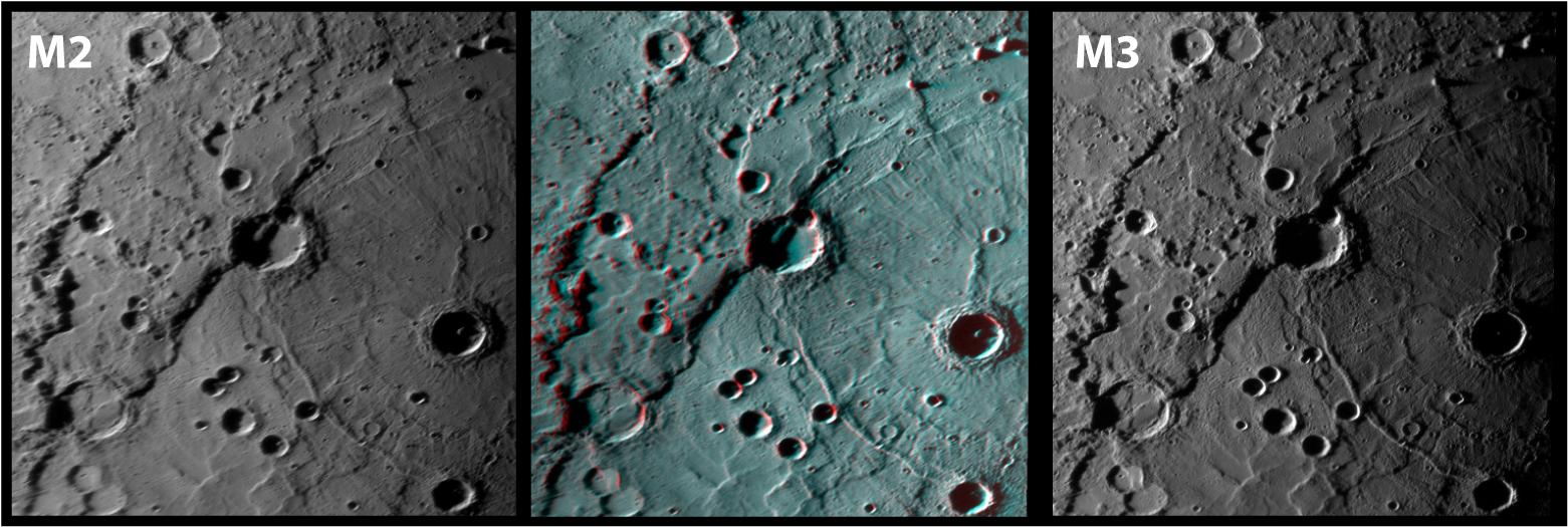 The central graphic shows a portion of Rembrandt basin (715 kilometers, or 444 miles, in diameter) as an anaglyph, or a three-dimensional (3D) image. Standard 3-D glasses (which can be assembled at home), with a red filter in front of the left eye and a blue filter in front of the right, can be used to view this picture. This anaglyph was made by overlaying two mosaics of the same area of Mercury taken from different angles. The viewing directions for the images of Rembrandt acquired during MESSENGER's third flyby (M3) on September 29, 2009, and second flyby (M2) on October 6, 2008, differ by approximately 20°. Combining the two viewing geometries creates a stereo effect, allowing the perception of exaggerated depth when viewed through 3D glasses. Here, the M2 image in red was superposed on the M3 image in blue to create the 3D image.