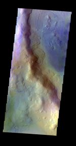 The THEMIS VIS camera contains 5 filters. The data from different filters can be combined in multiple ways to create a false color image. These false color images may reveal subtle variations of the surface not easily identified in a single band image. Today's false color image shows part of Renaudot Crater.