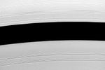 Like a placid lake surface disturbed by a boat, ring particles near the gap have their orbits perturbed by Pan's gravity, organizing themselves into wakes that stream away from the moon. The spacing of these wakes (their wavelength) increases with distance from the gap, as can be seen here.